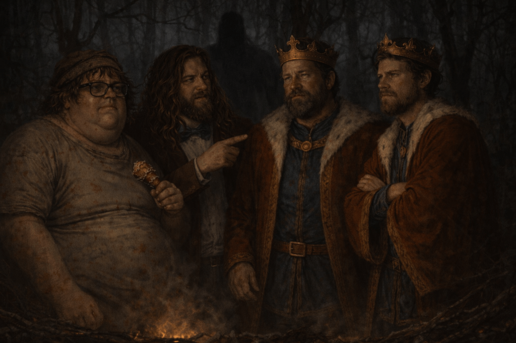 Baylor the Bound stood stiffly beside him, already uneasy with how permanent the gathering felt. Brentin leaned in slightly, listening, amused in the quiet way he always was when something ugly was being dressed up as necessary. The Beaver King stood at the center of it, firelight catching the fur of his cloak and the dull gold of his crown. Men. Woods. Flame. It felt impressive to him.