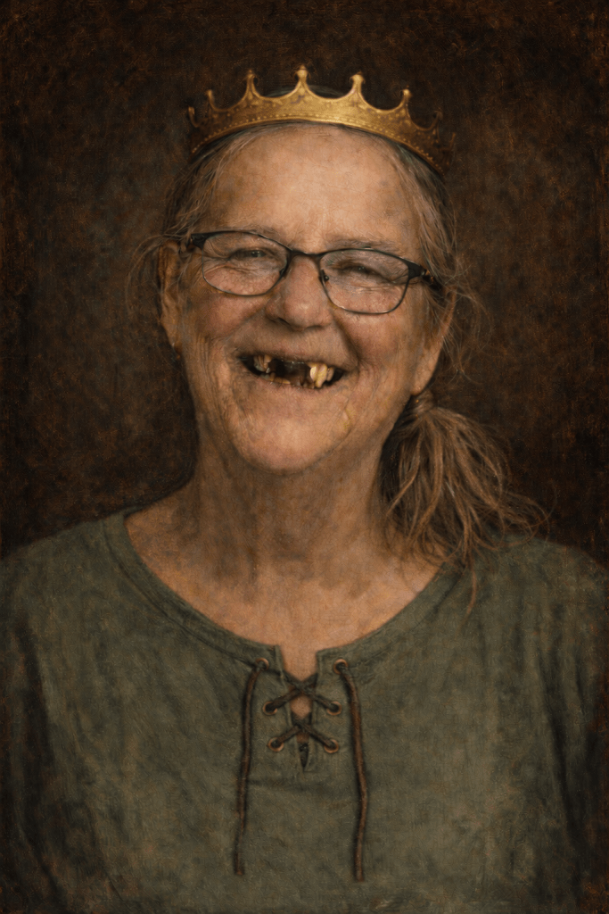 The now Dowager Queen Brynda is in her early seventies—a hard seventy, worn without grace or apology. Her hair is thin and stringy, gone gray with hints of dingy yellow, hanging as though upkeep was long ago deemed unnecessary. Her face is wide and deeply pruned with age, the features large and blunt, offering no softness for the eye to rest upon. Thick glasses sit heavily on her nose, magnifying eyes that squint not from frailty, but from suspicion. They do not wander. They measure.